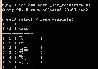 所以还需要设置结果使用的字符集,character_set_results=GBK;再次查询后结果如图: