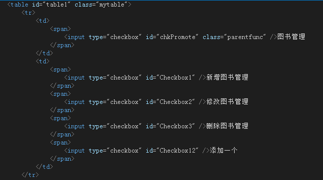 我们点击了大项的复选框,它后面的小项要被选中。我们看HTML代码会发现,三个大项与其后面的小项位置关系是相同的,我们借此实现功