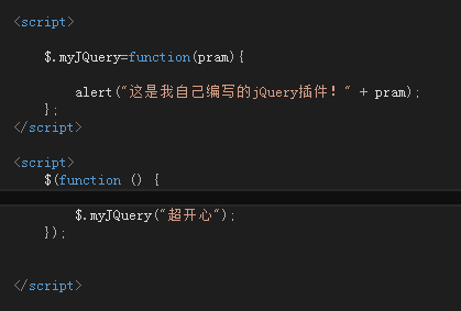 注意:我们编写jQuery插件应该在JavaScript页面单独编写,但由于在js 页面中,大多数的jQuery的方法无法点出来,不方便我们实际编写代码,所以我们可以在外面将方法写好,最后再封装成jQuery插件
